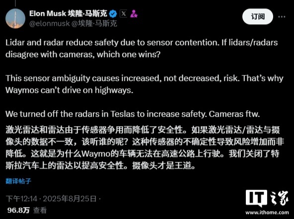 本周早些时候,针对其他车企对激光雷达和雷达的依赖,马斯克直言:“激光雷达和雷达会因‘传感器冲突’降低安全性。如果激光雷达、雷达与摄像头的感知结果不一致,该以哪个为准?这种传感器数据模糊的问题,只会增加而非降低风险 —— 这也是 Waymo 的车无法在高速公路行驶的原因。我们关闭特斯拉车型上的雷达,正是为了提升安全性。摄像头方案才是王道(Cameras ftw)。”
