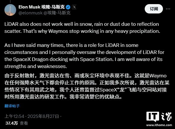 他表示:“受反射散射影响,激光雷达在雪、雨或沙尘环境下表现糟糕,这也是 Waymo 车辆在强降水天气里完全无法行驶的原因。正如我多次强调的,激光雷达在某些场景中确有用武之地 —— 我个人曾主导过 SpaceX‘龙’飞船与空间站对接时所用激光雷达的研发工作,因此我非常清楚这项技术的优势与短板。”